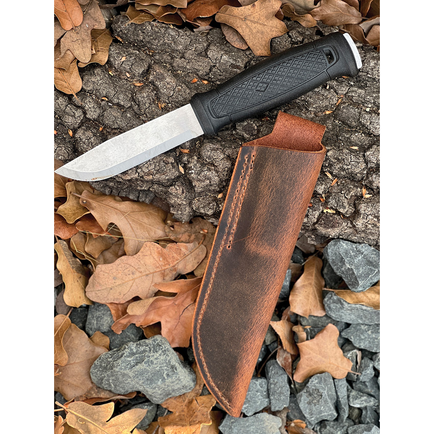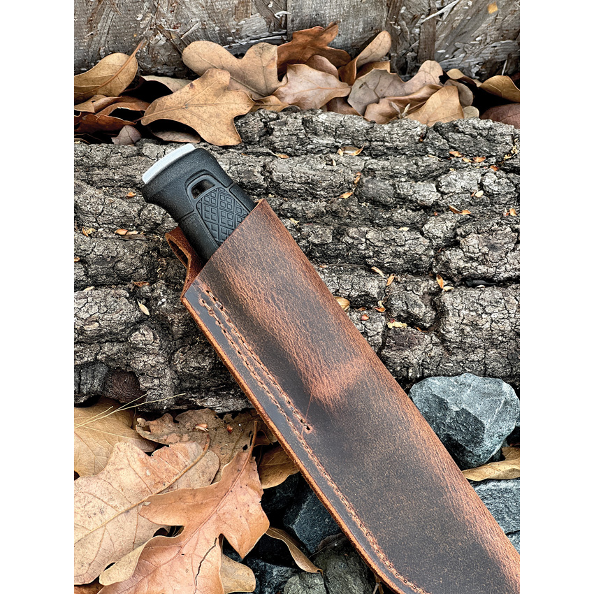 Will fit knives up to 10.25″ overall with a handle circumference of approximately 3.75″. Leather construction. Color: Brown. Bulk packed.