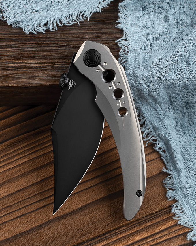 4.88″ (12.4cm) closed. 3.88″ (9.86cm) black stonewash finish M-Cut blade. Gray titanium handle. Thumb disk. Pocket clip. Boxed.