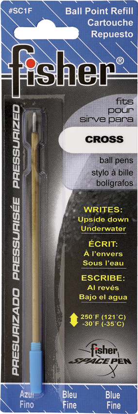 Blue, fine point. Fits Cross pens. Pressurized. Writes upside down, underwater, through grease, and in extreme temperatures. Hang packaged.