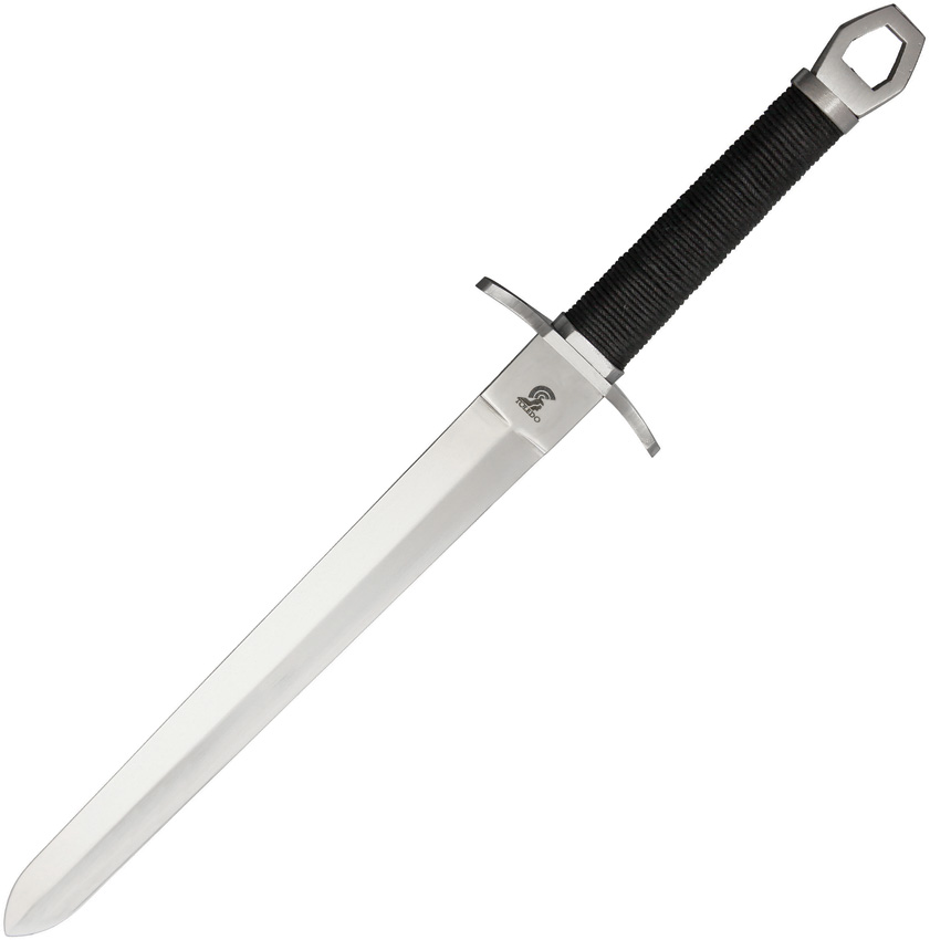 14.25″ (36.2cm) overall. 9.25″ (23.5cm) mirror finish unsharpened stainless blade. Black cord wrapped handle. Stainless bolster(s). Stainless guard. Lanyard hole. Black leather scabbard. Boxed.