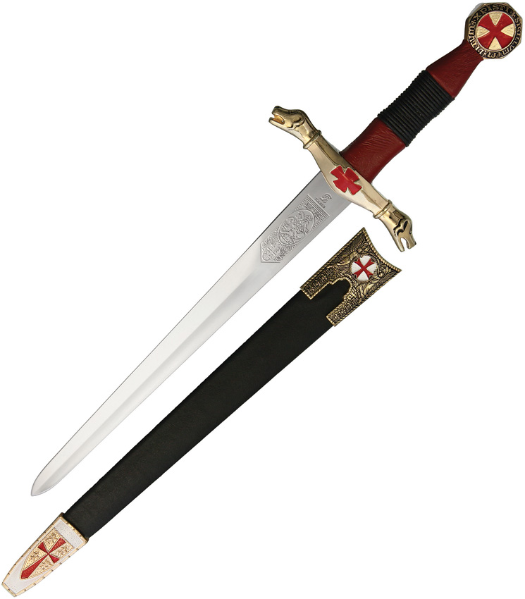 16.25″ (41.28cm) overall. 10.5″ (26.67cm) unsharpened stainless blade. Brass finish metal alloy handle. Red leather grip with black cord wrap. Black synthetic scabbard. Boxed.
