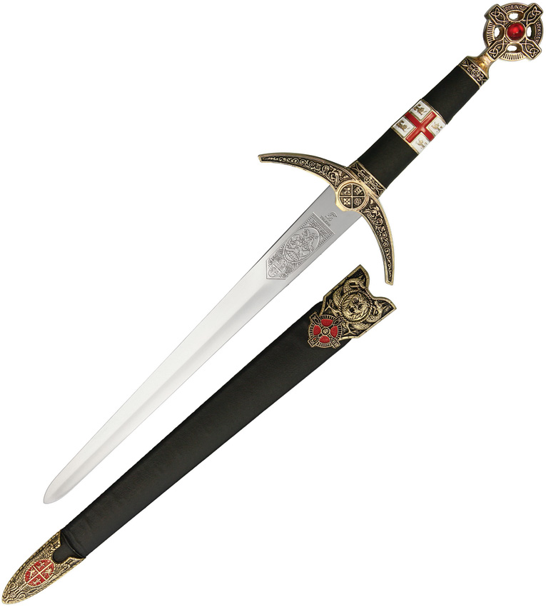 17″ (43.18cm) overall. 11″ (27.94cm) unsharpened stainless blade. Aged brass finish metal alloy handle. Black synthetic grip. Black synthetic scabbard. Boxed.