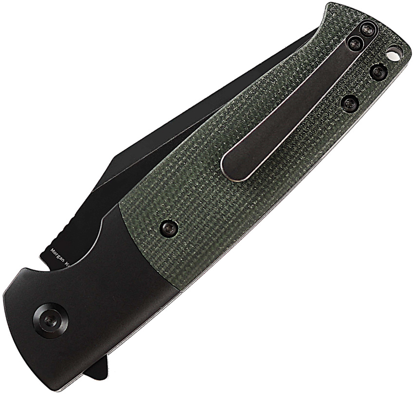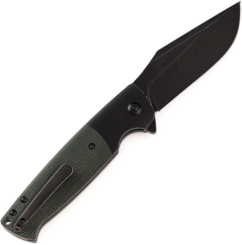 4.38″ (11.13cm) closed. 3.38″ (8.59cm) black stonewash finish 154CM stainless blade. Black aluminum handle with green micarta inlay. Extended tang. Lanyard hole. Pocket clip. Black nylon pouch. Boxed.