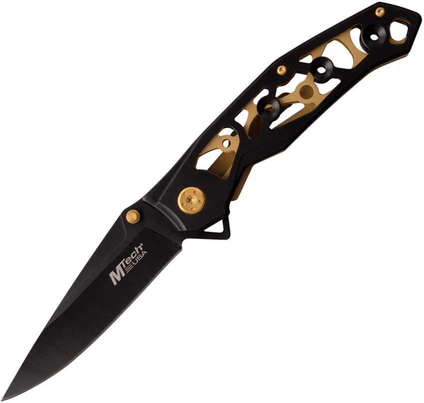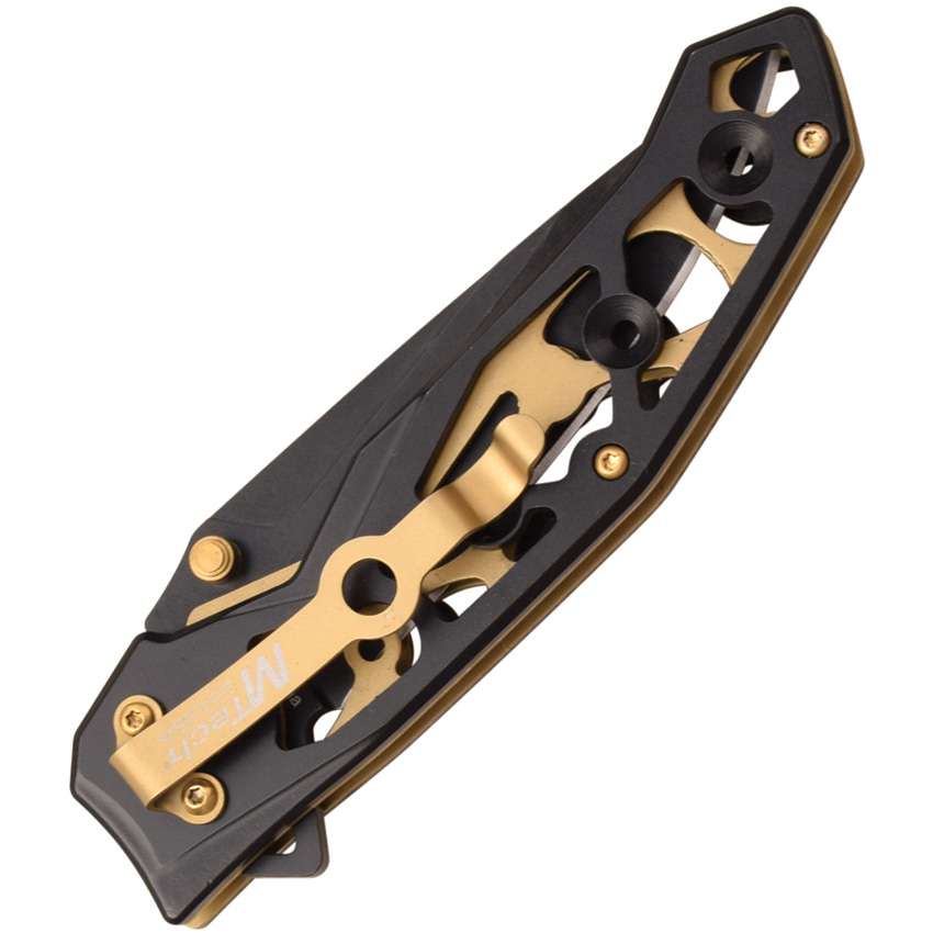 MTech Knives – Knife Black. 4.5″ (11.43cm) closed. 3.5″ (8.89cm) black finish stainless blade. Black and gold aluminum handle. Extended tang. Thumb stud. Lanyard hole. Pocket clip. Boxed. Made in China.