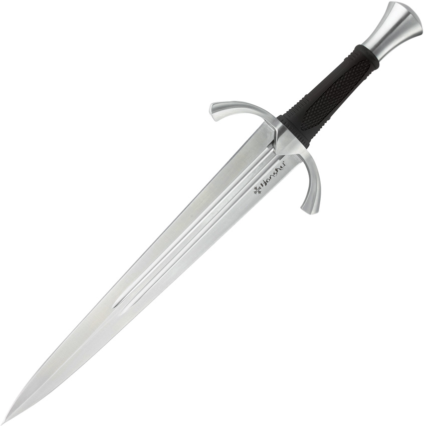 19.5″ (49.53cm) overall. 13″ (33.02cm) satin finish double edge 7Cr17MoV stainless dagger blade. Black textured TPR handle. Stainless guard and pommel. Full tang. Black leather belt sheath. Boxed.