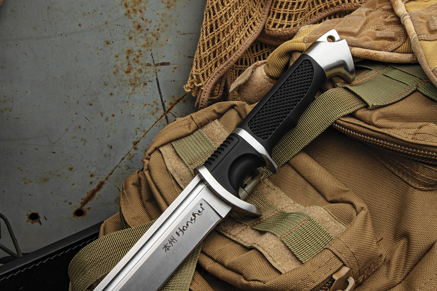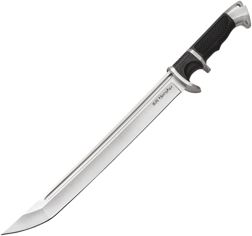17.25″ (43.82cm) overall. 11.38″ (28.91cm) tanto blade. Black textured TPR handle. Lanyard hole. 7Cr13 stainless blade. Stainless sub-hilt. Black polyester belt sheath. Boxed. No Amazon Sales