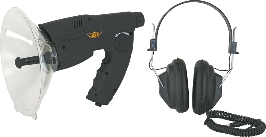 Handheld device features: parabolic sound collecting dish, microphone, on/off switch, 8x monocular, frequency controller, record button, playback button and headphones. Hear and digitally record sounds over 300 feet away. Requires 9v battery, not included. Boxed.