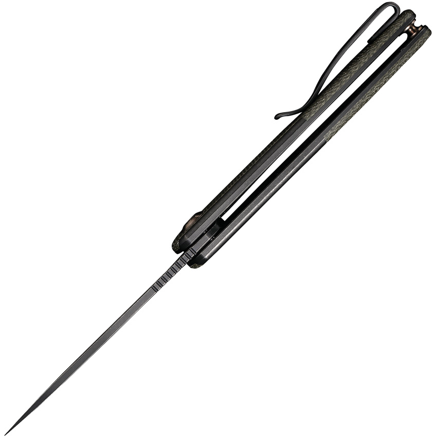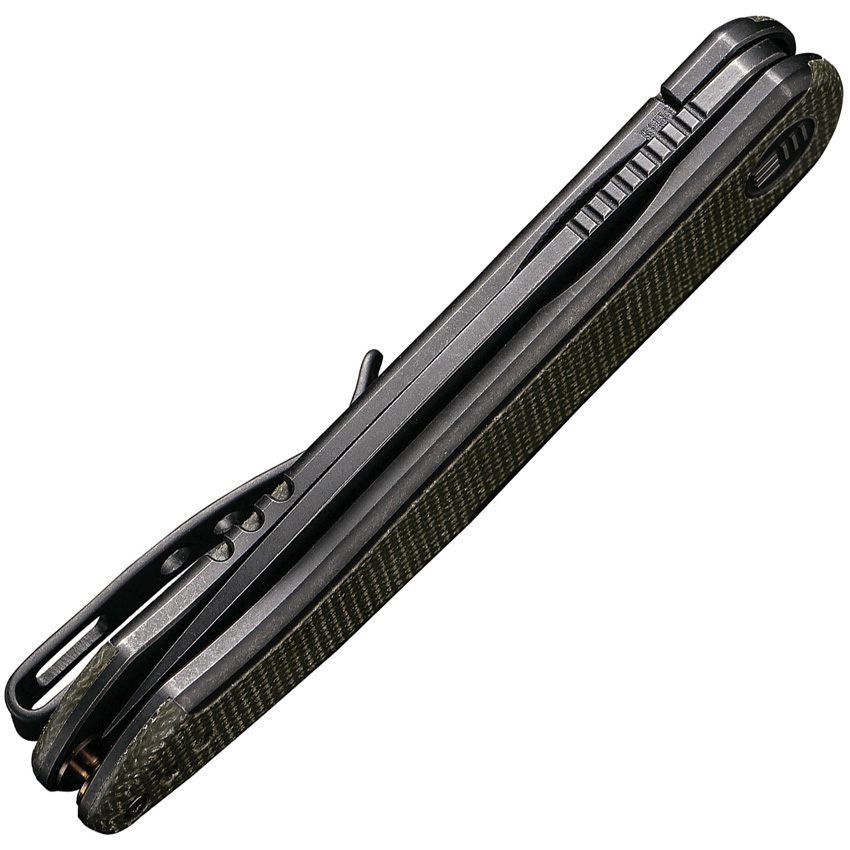 4″ (10.16cm) closed. 3″ (7.62cm) black stonewash finish CPM-20CV stainless blade. Black titanium handle with Green micarta onlay. Extended tang. Pocket clip. Boxed.